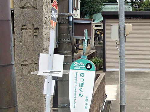 由来を調べたらネーミングライツ(命名権売買)だそうなので珍しさも中くらいといったところでしょうか。近所の自然食品店だそうです。「のっぽくん」だけでは分かりにくいのか、「本町2丁目」も合わせてアナウンスされるそうです。同じ場所にある北鉄バスのほうは「東野々市」バス停を名乗っています。のっティは一般公募によるコミュニティバスの愛称だそうです。 GoogleStreetView |