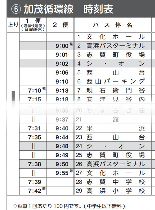 バス停ではないのですが、(2025年9月現在)全国でも珍しい「通学快速」が、志賀地域コミュニティバスの、加茂循環線と中甘田・甘田循環線で運転されています。コミュニティバスじたいは中学生以下は無料とのことです。 |