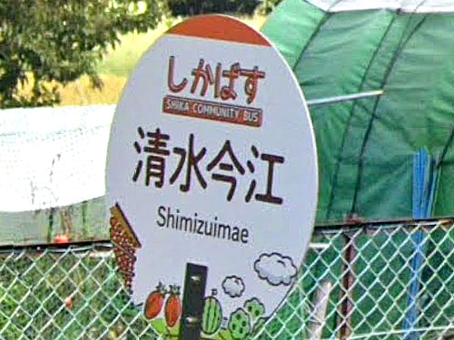 姓名のように見えるバス停です。「しみずいまえ」さん。「清水今江集会所」バス停もあるとのこと。公的住所として「清水今江」が登録されている他、清水今江甲(こう)、清水今江丑(うし)、清水今江辰(たつ)、清水今江ト、清水今江ヌ、清水今江へ、清水今江ホ、清水今江マ、清水今江ル、清水今江後山(うしろやま)もあるそうです。一方で、単純な「清水」や「今江」は公的住所にありません。調べましたが清水今江の由来は分かりませんでした…。 GoogleStreetView |