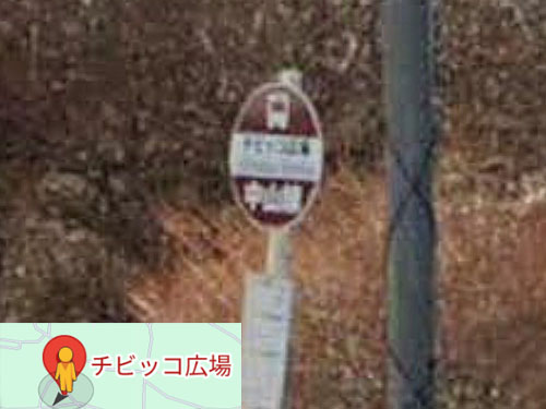 「ちびっこ」というふりがなのバス停は、Navitimeによると11箇所だそうです。そのうちの1つ、シンプルな「チビッコ広場」ですが、バス停標がよく見えなくて残念です…。