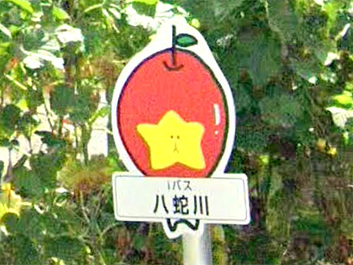 「蛇」を「だ」と読むそうです。「支流は八方に広がって、まるでヤマタノオロチを彷彿とさせることから名付けられた」(Wikipedia)。りんごの形のバス停標がかわいいですね。 GoogleStreetView |