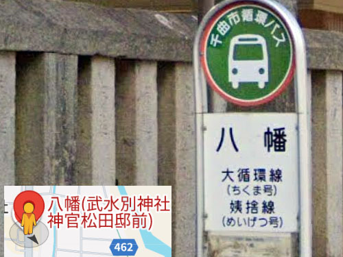 現地のバス停名には入っていませんが、NavitimeやGoogleMapsには()内も登録されています。武水別神社は「善光寺平の豊穣と千曲川の氾濫防止を祈って祀られた」とのこと。神官松田邸前は千曲市指定文化財だそうです(以上Wikipedia)。Navitime、ジョルダンなどにバス停名の読みが正確にあがっていませんが、もし左の読みが正しければ、読みだけで25文字となり、かなり長いほうです。