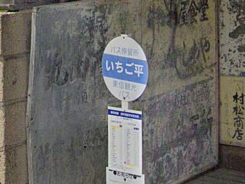 いちごの生産が盛んな場所だそうです。ここはバスの終点で、「いちご平」という行き先が表示されたバスが走るそうで、なんとなく可愛い感じがします。是非見てみたいです。GoogleMapsではこのバス停が「閉業」となっていますが、今でも経路検索でちゃんと出てはきます。 GoogleStreetView |