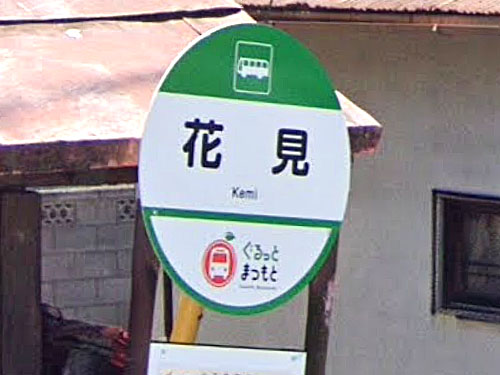 「はなみ」ではなく「けみ」だそうです。「ケミ」とは、日陰や湿地、田の中の小さい林、沼地などのことで、この場所は両側に山が迫っているそうです。 GoogleStreetView |