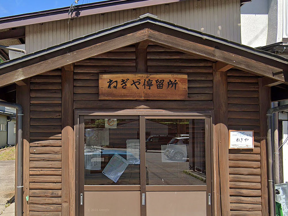 五月日バス停と共通と思われる待合室がちょっと可愛い印象です。漢字で書くと祢宜屋のようです。名前の由来は分かりませんでした…。 GoogleStreetView |