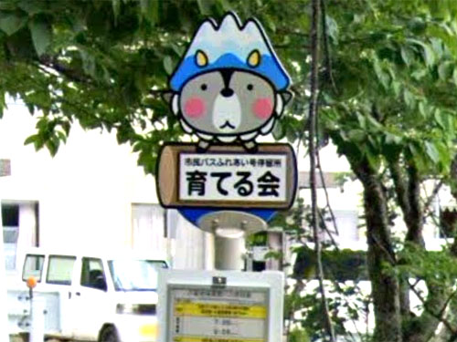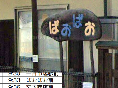 バス停標が見当たらないのですが、名前がかわいいのでとりあげてみます。系統図も見当たらず、バス乗り場がここかどうかも分かりません。ぱおぱおは子育て支援施設だそうです。現時点では木曜のみ運行とのこと。 GoogleStreetView(バス停標、バス乗り場不明) |