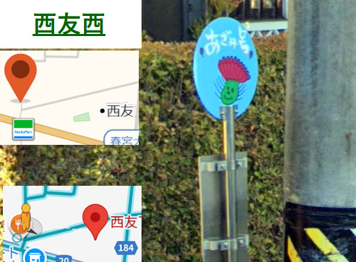 「山本山」形式のバス停です。「西友」という店名が使われているのがポイントです。バス停名が見えなくて残念です…。県内の他の「山本山」形式:中原中、南原南