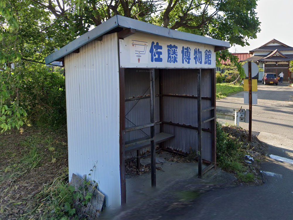 バス停名ではなく、この待合室の雰囲気に惹かれました。佐藤博物館という名前も素朴で素敵です。ここから徒歩13分のところにありましたが、2008年に閉館となっているそうです。初代館長だった佐藤さんが、武具甲冑を集めた博物館だったとのことです。 GoogleStreetView |