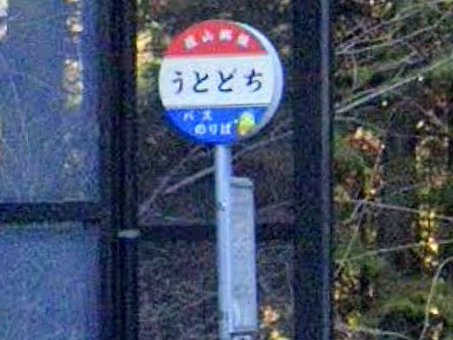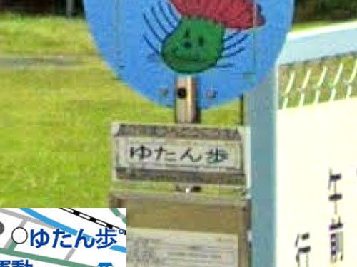 「ゆたん歩゜」は健康温泉センターとのことです。独立した半濁点「゜」が付いたバス停はかなり珍しいと思います。バス停ポールの名前のうち「゜」がはっきり見えなくて少し残念です…。 GoogleStreetView |