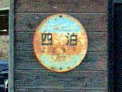 「よんぱく」ではありませんでした。由来は分かりませんでした…。雪国で時々見かける、待合小屋に直付けの丸板でした。 GoogleStreetView |