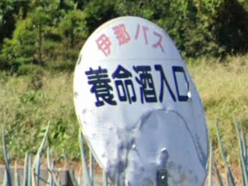 「養命酒工場入口」などではなく、ずばり「養命酒入口」です。見るだけで健康になれそうなバス停です(笑)。ここから山の方向に入った場所に養命酒製造商品開発センターがあります。養命酒の誕生はなんと江戸幕府誕生前年の1602年だそうで、徳川家康にも献上されたとのこと(Wikipedia)。