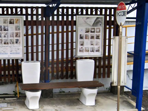 珍名ではありません。バス停のベンチに便器が使われています。ジャニス工業が便器を製造しているため、PRを兼ねて設置したそうです。ジャニスは焼き物の盛んな常滑で創業したとのこと。 GoogleStreetView |