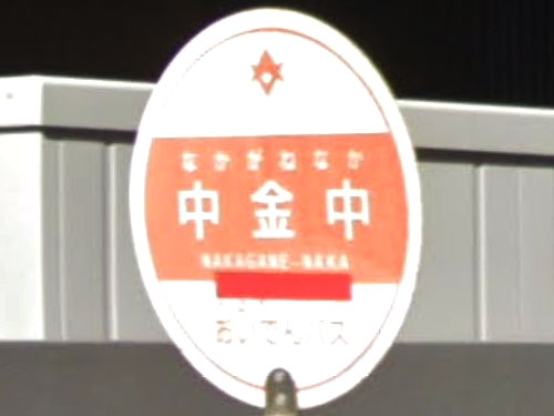 「山本山」形式のバス停です。中金の由来は、地内に金石という大きな石があったことによるそうです。近くには、廃止された西中金駅(名古屋鉄道三河線)がありました。県内の他の「山本山」形式:下部下、東山東