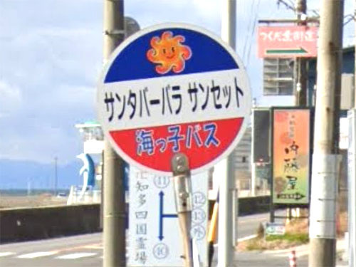 施設の名前のバス停ですので珍しさも中くらいですが、「サンタバーバラ サンセット」と書かれたバス停がちょっとエモいと思います。施設はキャンプ&グランピングリゾートだそうです。カリフォルニアの美しい街「サンタバーバラ」の雰囲気を味わえるとのこと。バス停のある道は夕焼けがきれいに見えそうな海に面しています。 GoogleStreetView |