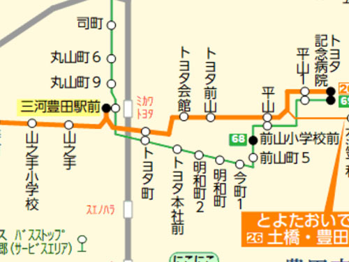 | 愛知県 | トヨタ町 | 豊田市 | ![]() GoogleStreetView ![]() とよたおいでんバス路線図 |