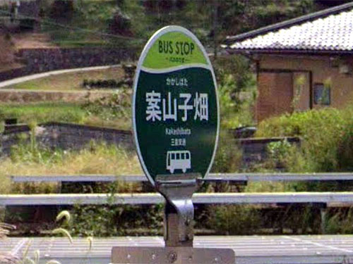 「案山子」という文字が入っているバス停はここしか把握できていません。近くに、リアルな案山子のいる畑があることからこう名付けられた、という情報があります。 GoogleStreetView |