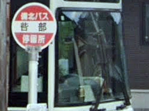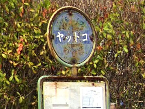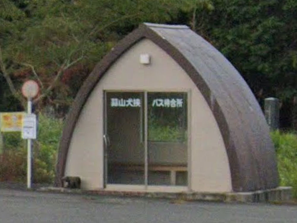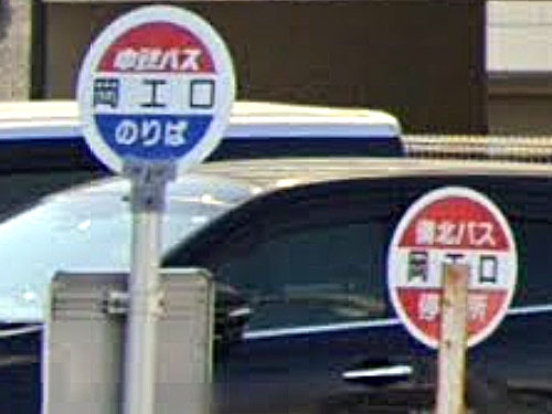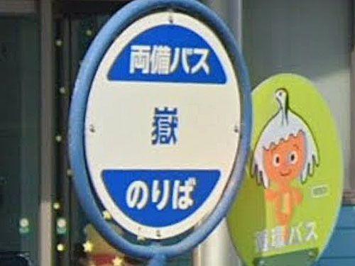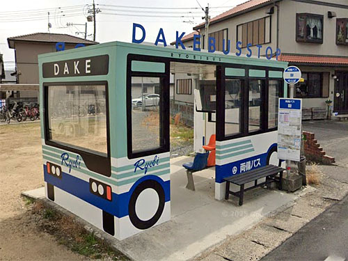 「嶽」は、常用漢字にすると「岳」で、「ごつごつと高く険しい山」を表しますが、現在GoogleStreetViewで見渡してもおだやかな地形が見えるのみです。由来は分かりませんでした…。「嶽」1文字のバス停はレアで、ここしか把握できていません。 かわいいバスの形の待合室があります。「バスの車両の形をした待合所がお目見えした。乗客に待ち時間を楽しく過ごしてもらうのが狙い。」(毎日)とのこと。 GoogleStreetView |