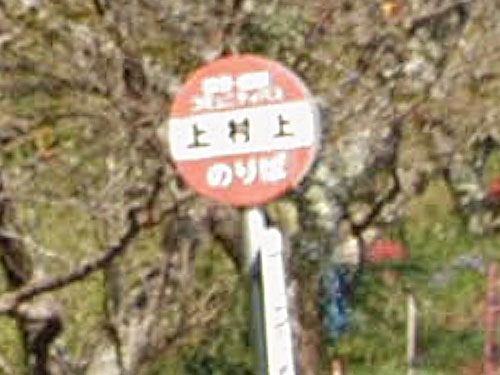 「山本山」形式のバス停です。「上・野上」とも受け取れますが、近くのバス停が「上野下」なので、ここは「上野・上」のようです。県内の他の「山本山」形式:下畑下 GoogleStreetView |