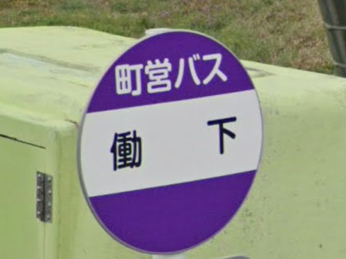 「働」を「かせぎ」と読む地名ですが、公的住所ではないようです。「働」1文字のバス停はありませんでした。調べましたが由来は分かりませんでした…。和気町のFacebookによれば「江戸時代には「鬩」と書いたそう」とのこと。他に「働コミュニティハウス」というバス停もありますが、バス停ポールが見当たりませんでした。
