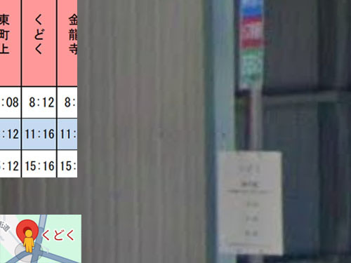 ひらがなだけのバス停なのですが、StreetViewでは読めませんでした。時刻表示の上に、かろうじて「くどく」と書いてあるようには思えますが…。もとの漢字が何か、とか、ひらがなで書いてある由来は調べても分かりませんでした…。 GoogleStreetView |