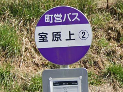 珍しい◯付き数字ありのバス停です。他に「室原上[1]」「室原下[1]~[2]」があります。