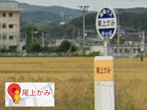 2つの「上」の字が重なりそうになり、1つをひらがなに変えたと思われるバス停です。尾上が公的住所になっていて、尾上地区の中ではこのバス停は川の上流側(かみの方)にあるようです。「尾上しも」バス停もあります。 GoogleStreetView |