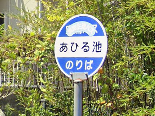 きれいな住宅街の中に、のんびりした名前のバス停があります。近くには確かに池があるのですが、名前はわからず、StreetViewでは手前にフェンスが張られているように見えます。あひるがいるかどうかは分かりませんでした。 GoogleStreetView |
