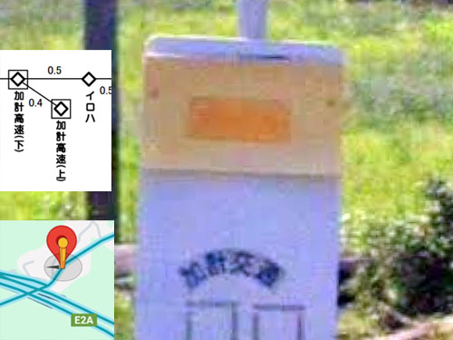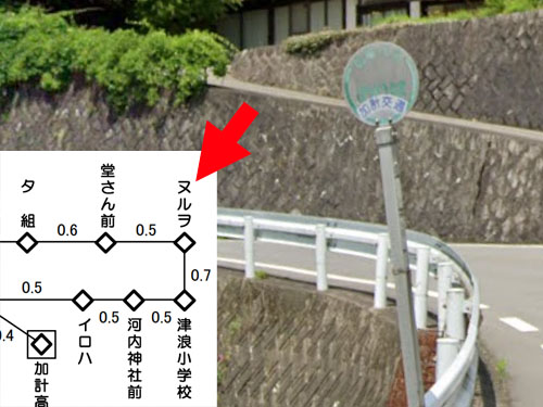 日本で1つだけの名前のバス停です。バス停の名前が消えてしまっていますが、国土交通省のGPSデータでここが示されました(また、実際に行かれた方がこのバス停がイロハであることをバス会社に確認したそうです)。高速道路の北側にあるバス停で、路線図ともあっています。公的住所になっておらず、由来は分かりませんでした。周辺は田園地帯で、近くにイロハというお店があるわけでもないようです。ここの住所は津浪となります。近くに、JR可部線のうち廃止となった区間の津浪駅があります。 GoogleStreetView |