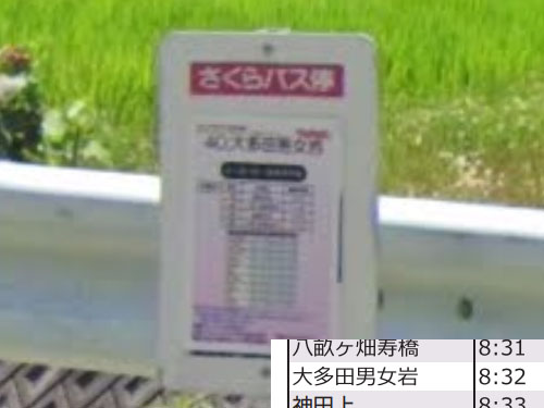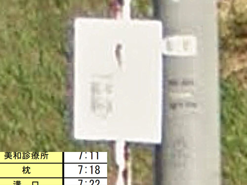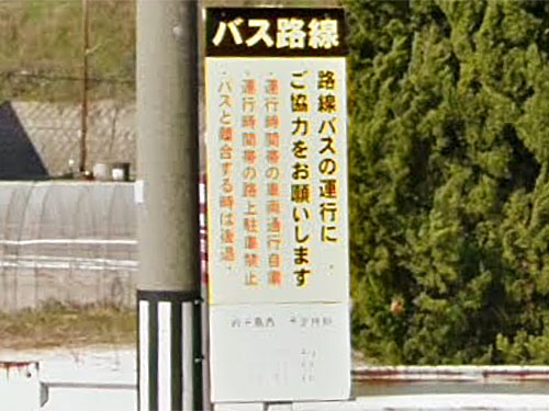 珍しい「枕」1文字バス停で、把握しているのは全国でここだけです。写真ではバス停標がはっきりしないのと、最新のStreetViewではバス停標が見えなくなっているのが残念です。現在1日最大13便が停車するようです。 GoogleStreetView |