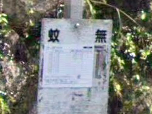 「蚊」がつくバス停は多くはありません。「「峠付近の山稜が藪と化し、蚊の群がる地であることによる命名と考えられる。」「弘法大師が此地を過ぎて宿泊し、加持して蚊を退治したので名づけた地名であるという」とある」(レファレンス共同データベース)。蚊は病気を媒介するので、全世界的に蚊の被害がなくなるといいですよね…。 GoogleStreetView |
