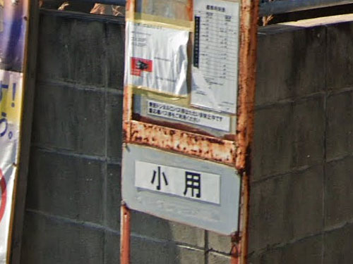 名前を見るとちょっとドキッとしますね。読み方は「こよう」でした。小用港があります。小用の由来は分かりませんでした…。同じ名前のバス停が江田島市(小用港前)にもあります。また、呉市に小用2丁目バス停(小用浦近く)他3つの「小用」と付くバス停があります。広島県では、港に「小用」と名付ける習慣でもあったのでしょうか…。 GoogleStreetView |