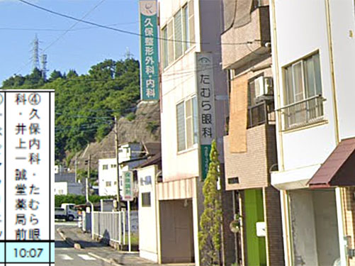 2つの施設名がセットになったバス停は時々見かけますが、3つは珍しいと思います。ストリートビューを2013年まで遡ってやっとバス停標を見つけましたが、こちらは「久保内科整形外科 たむら眼科 井上一誠堂薬局前」となっていて、国土交通省やNavitimeのデータ(久保内科・たむら眼科・井上一誠堂薬局前)とは、久保内科の表記で違いがあります。現在のStreetViewで街なかを見ると、「たむら眼科」と「久保整形外科・内科」の看板が見えます。同じこの路線には、「鍋桟橋・中原歯科・角西歯科前」バス停もあります(鍋桟橋は桟橋の遺構)。 GoogleStreetView(2013) |