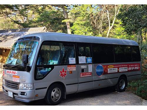 一般の路線バスではありません。ロープウエーの駅まで行ける無料バスの終点です。バスの待機場所が狭く、後輪より後ろがかなりはみ出すことで知られています。後ろのほうに乗った外国人があわてたりするそうです。