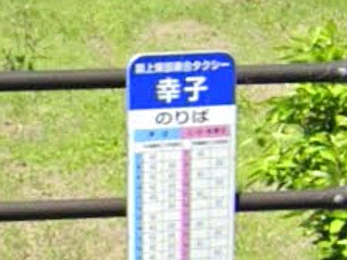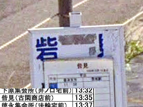 「呰」には「そしる。非難する/きず。欠点。わざわい」という意味があります。呰が使われるバス停はレアです。バス停じたいでは「見」の字が(2013年のストビュ撮影の時点から)何かシールで覆われてほとんど見えないですし、「呰」が「砦」になっている、ちょっとこまったちゃんな感じです。コミュニティバスのホームページにはきちんと「呰見」で時刻表が載っています。 GoogleStreetView |