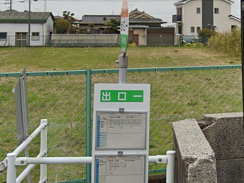 「二」(ふた)が公的住所になっています。停留所の読みも「ふた」で良いかと思われます。住所の由来は分かりませんでした…。2022年のストリートビューには停留所標は載っていますが、2024年のストビュにはありませんでした。また、現在の筑前町のコミュニティバスの路線図には「二」はありません(停留所番号101番が欠番)。なので、「二」停留所は廃止されたのかも知れません。他にない珍しい一文字停留所なので残念です。北東方向すぐの場所に「二公民館前」停留所(停留所番号100番)が現在もあります。 GoogleStreetView(2013) |