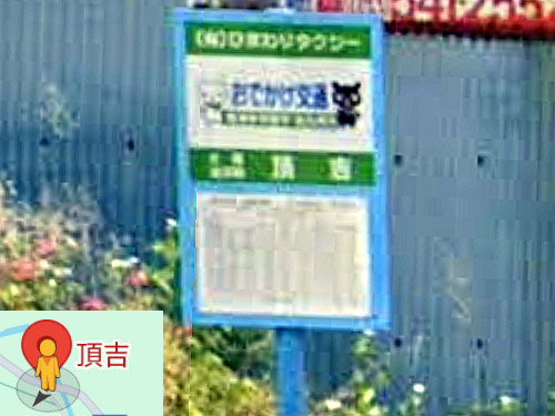 「頂吉」が地名になっています。難読ですね。「「頂む」とは「かごむ」若しくは「かぐむ」と読み、頭上に物を載せるという意味。」「大河内川の上流域に、大きな巌がある。その巌は比較的ちいさな岩の上に重なって乗っている。その姿が大巌を頂(かぐ)めている形をしているので、「頂石(かぐめいし)」という号がつけられた。いつのころからか「頂石」が「頂吉」という文字にかわった。」 「頂吉越」という地名・バス停は「かぐめごし」と読むそうです。 GoogleStreetView |