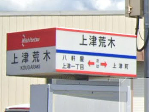 難読バス停です。久留米市「上津町」(かみつちょう)にあるのに読み方が違います。「上津荒木と書いてコウダラキと読むのは…ある説によると、佐賀県の厳木(キュウラギ)、大牟田の教良木(きょうらぎ)、熊本県の多良木(たらき)多良木の近くに「古多良木」という所がありますが、これらはクダラキ「百済来」が訛ったものであるといわれています」(東林寺天満宮)。昔は上津荒木村があったとのこと。 GoogleStreetView |