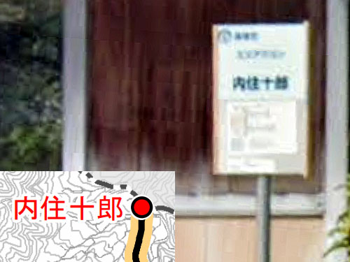 姓名のように読めるバス停です。「うちずみじゅうろう」さんと読めそうです。 「内住」は他のバス停で「ないじゅう」と読んでいるのでそれでよいと思うのですが、「十郎」は正確には分かりませんでした。由来も不明でした…。 GoogleStreetView |