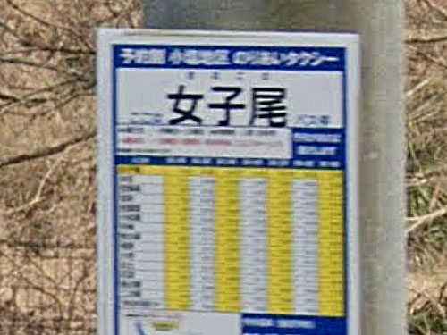 女子の尾と書いておなごのとは珍しい読み方ですね。近くに女子尾不動尊があります。名前の由来は分かりませんでした…。 GoogleStreetView |