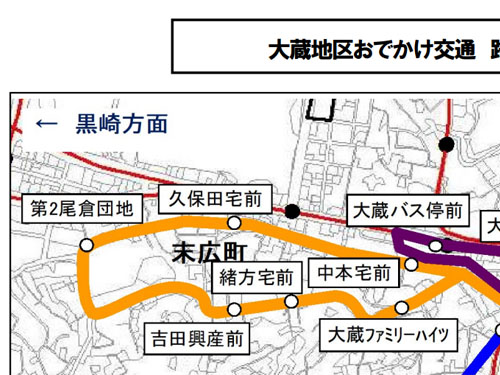 珍名ではないのですが、大蔵地区おでかけ交通の25あるバス停のうち、「〇〇宅前」など個人名が使われていると思われるバス停が8つもありました(「宅下」「宅横」を含みます)。「宅前」バス停の比率が高い路線と言えると思います。 大蔵地区おでかけ交通路線図 |