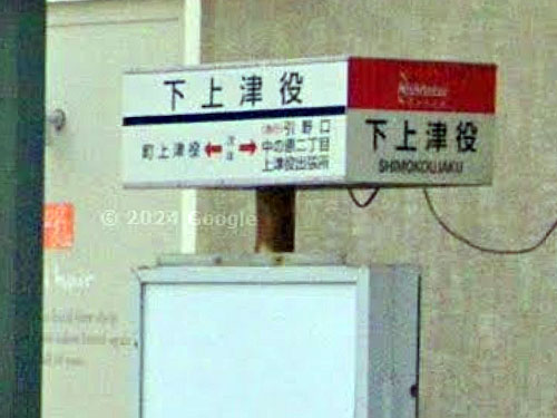「上津役」(こうじゃく)が難読地名になっています。「延喜式(平安中期の法典)にこの辺りの地名として「夜久の駅(やくのうまや)」と記されており、後年「夜久」が「役」に転じ、さらに上津,下津に分かれたのが上津役の由来といわれる(ただし下津役という地名は現存しない)」(Wikipedia)。単に「上津役」というバス停はないので、最初に「下」がついたものを挙げてみました。 GoogleStreetView |