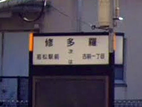 若松区にある難読地名です。「難破した遣唐使の船から若松の浜辺に打ち上げられた残骸には多くのお経の版木が含まれていた。それらは供養のために高塔 山に埋葬され、以来その村は仏教の経典(スートラ)を意味する修多羅と呼ばれるようになった」(見えない都市 ― 地名の解剖学 北九州の難読地名を解説)。 GoogleStreetView |