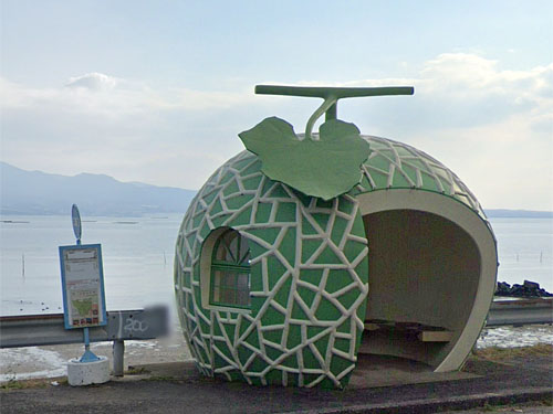 珍名ではありません。「メロンのバス停」として知られているそうです。1990年の長崎旅博の際に、この旧・小長井町が長崎県の玄関口にあることから、訪問者を迎えるために作ったそうです。海を背景にした巨大なメロンがちょっとシュールだと思います。他に、スイカ、いちご、みかん、トマトがあり、これらはこのエリアの産物だそうです。