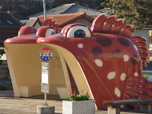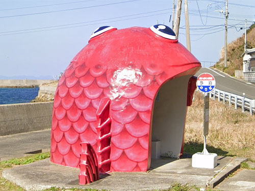 少しめずらしい漢字が使われてはいますが、珍しいのは待合所が魚の形をしていることです。4箇所あり、「お魚バス停」と呼ばれています。市特産のアラカブが主体とのこと。インスタ映えするということで人気が出ているそうです。 GoogleStreetView |