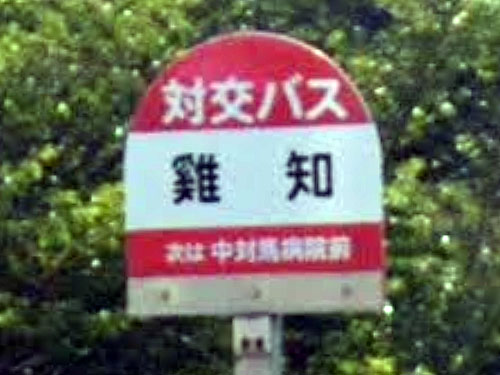 バス停には「雞」という「鶏」の古字体が使われています。「雞知という地名は神功皇后にまつわる故事が由来となっている。 その故事とは「神功皇后が新羅国を征伐した後、対馬に立ち寄り黒瀬の城嶽(しろだけ)に登り、四方を眺めた際、遠方から鶏の鳴き声が聞こえて人家の場所を知り、その場所を訪れた際に雞知(けち)と名付けた」というものであった」(鶏知中学校)。 GoogleStreetView |