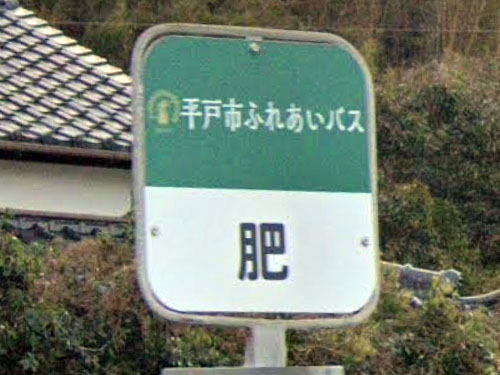 全国で唯一と思われる「肥」1文字のバス停です。名前の由来は分かりませんでした…。 GoogleStreetView |