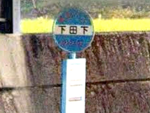 「山本山」形式のバス停です。「下・田下」だそうです。名前の由来は分かりませんでした…。 GoogleStreetView |