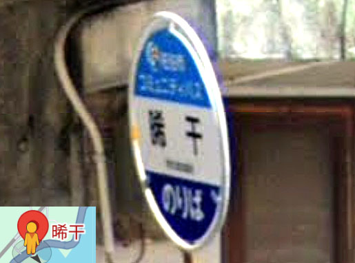 一文字バス停名で、珍しい字が使われていますね。由来は分かりませんでした…。 GoogleStreetView |