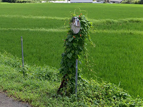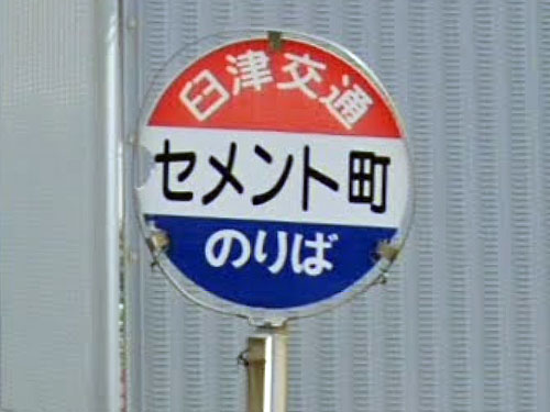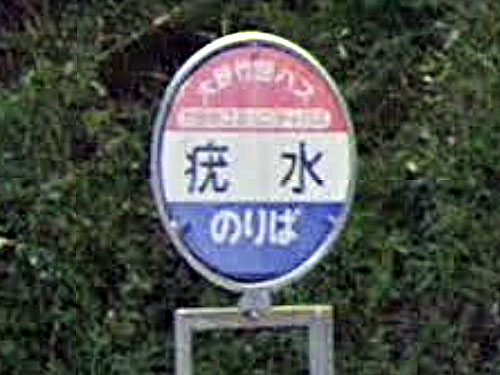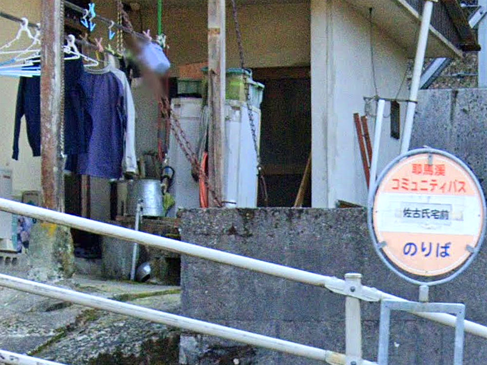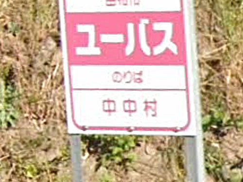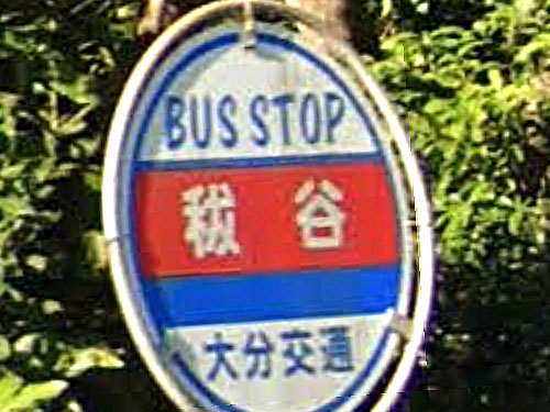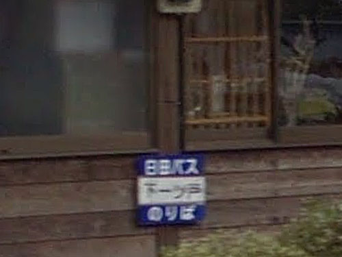 一文字バス停名も珍しいですが、民家の小屋か何かの軒下にバス停標がとりつけられています。「日田バス民家系バス停」としてまとめていらっしゃる方がいます。 GoogleStreetView |