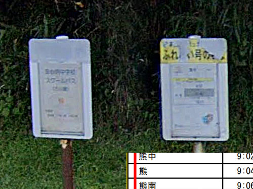 「熊」1文字のバス停はここだけかと思います。写真の左側は中学校のスクールバスのようで、詳細は分かりませんでした。近くには熊神社があります。ただ、熊神社も熊集落も名前の由来は分かりませんでした…。 GoogleStreetView |